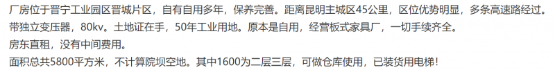 • 晉寧工業園5800平獨院有證廠房出租