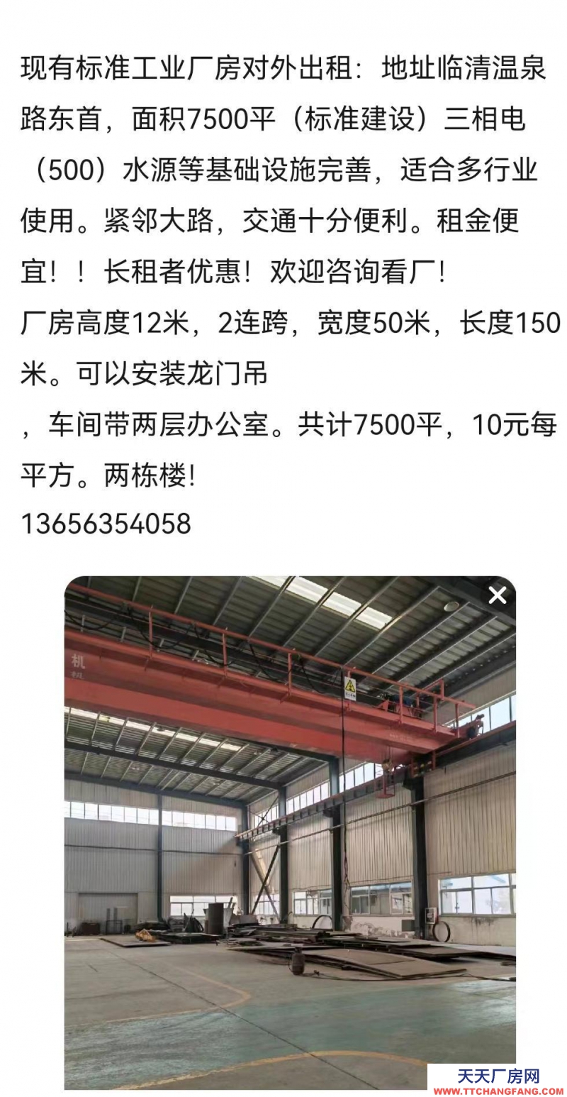 現(xiàn)有標(biāo)準(zhǔn)工業(yè)廠房對(duì)外出租:地址臨清溫泉路東首,面積7500平(標(biāo)準(zhǔn)建設(shè))三相電(500)水源等基礎(chǔ)設(shè)施完善,適合多行業(yè)使用。緊鄰大路,交通十分便利。租金便宜!!長(zhǎng)租者優(yōu)惠!歡迎咨詢看廠!
